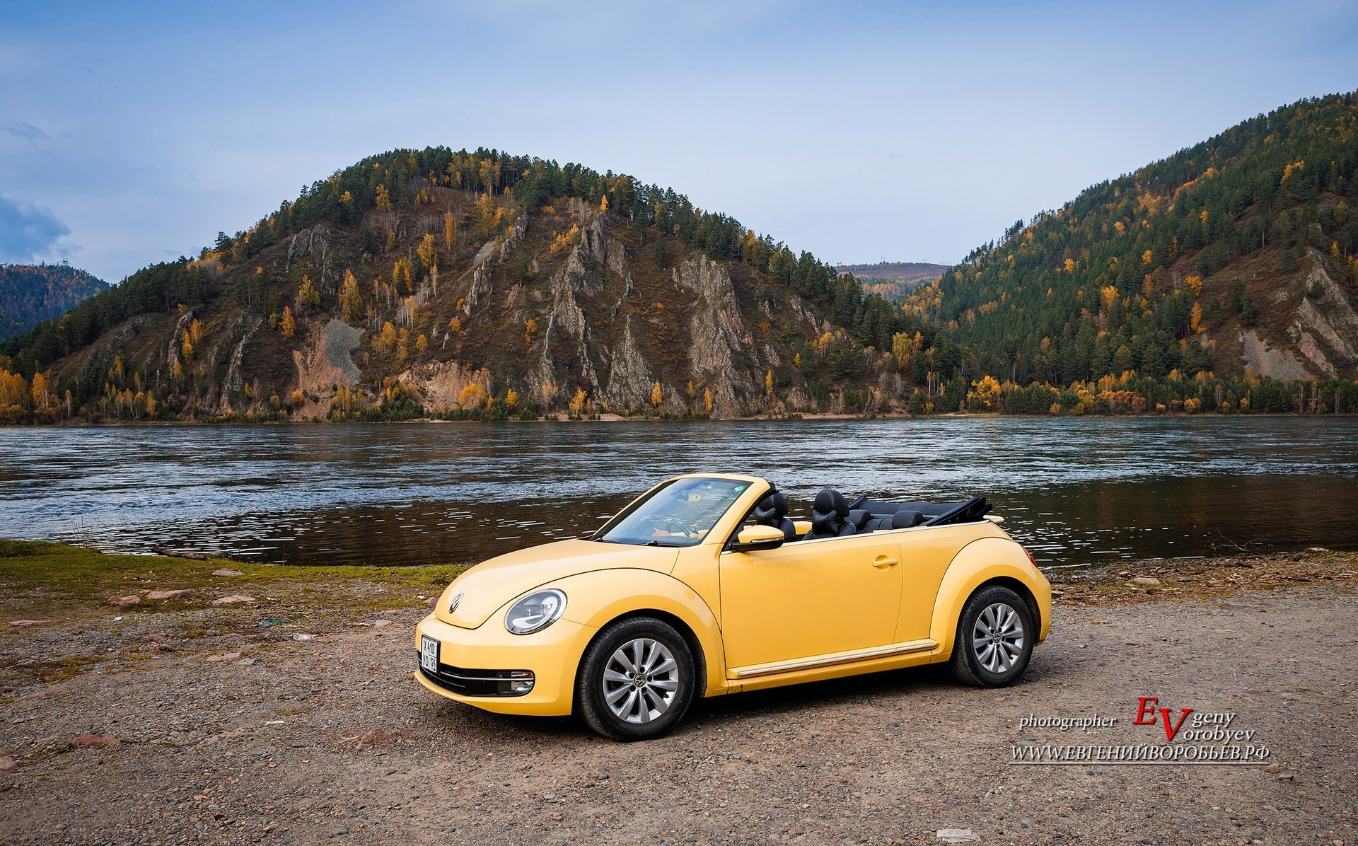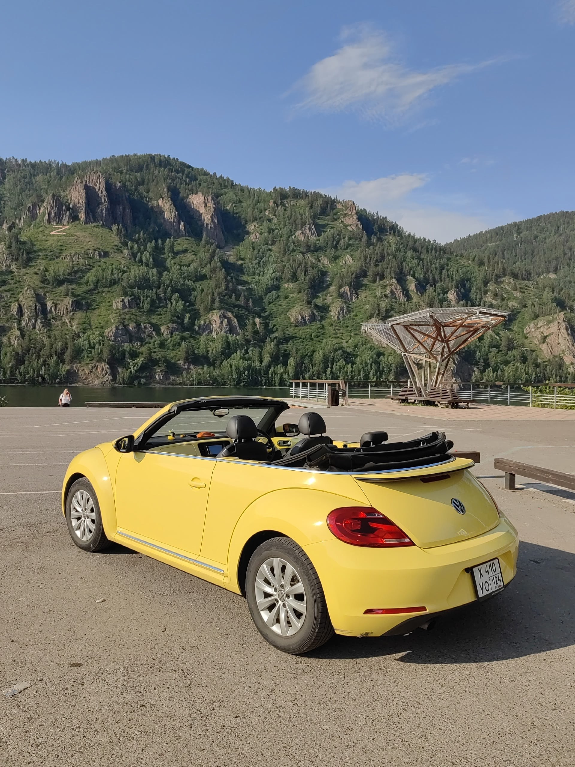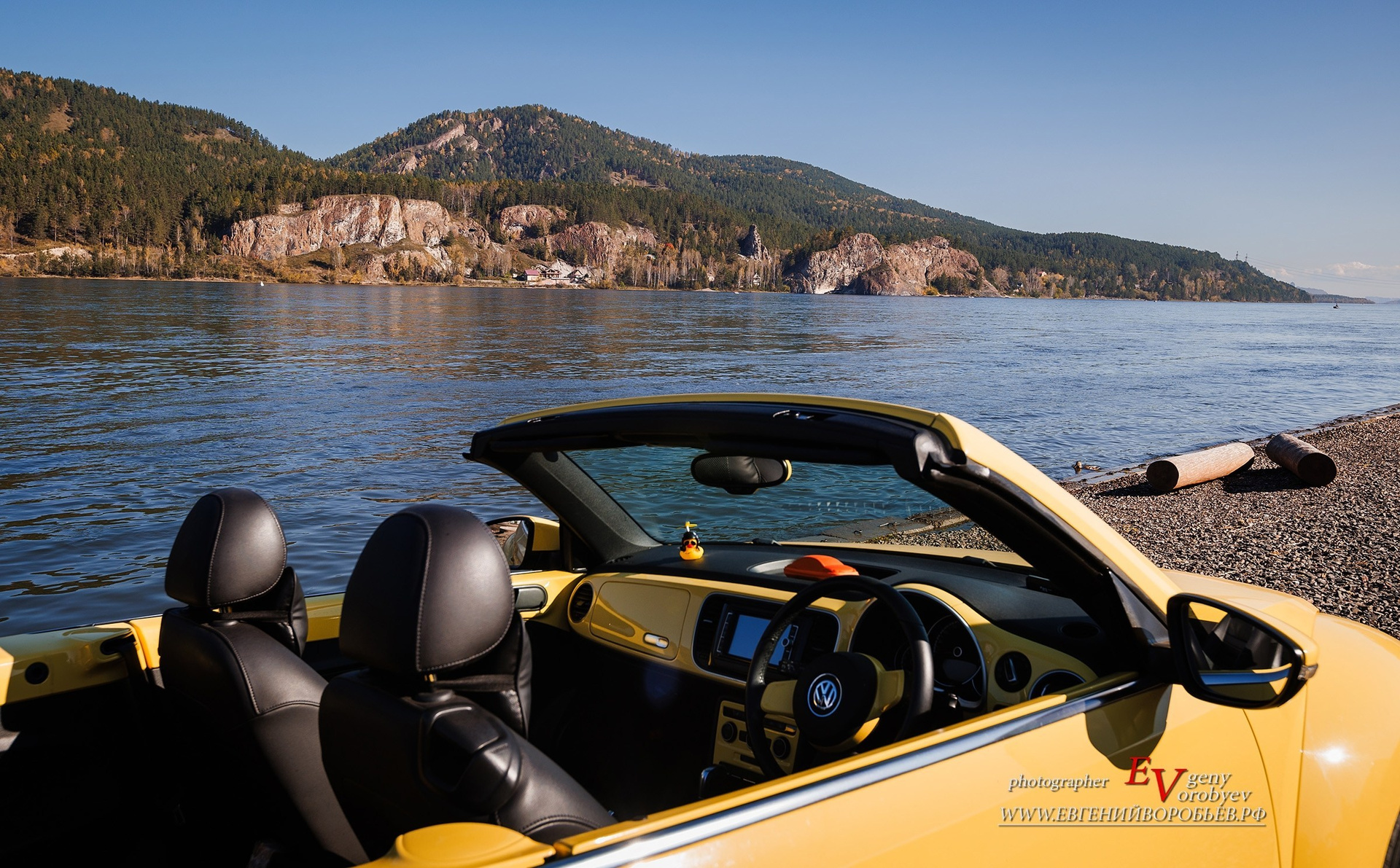 Когда тепло: легендарный кабриолет Volkswagen Beetle — тот самый Фольксваген Жук жёлтого цвета, для 3 пассажиров — незабываемые эмоции от поездки на кабриолете по Красноярску, стильные фото с ретро‑автомобилем на фоне городских и природных достопримечательностей.