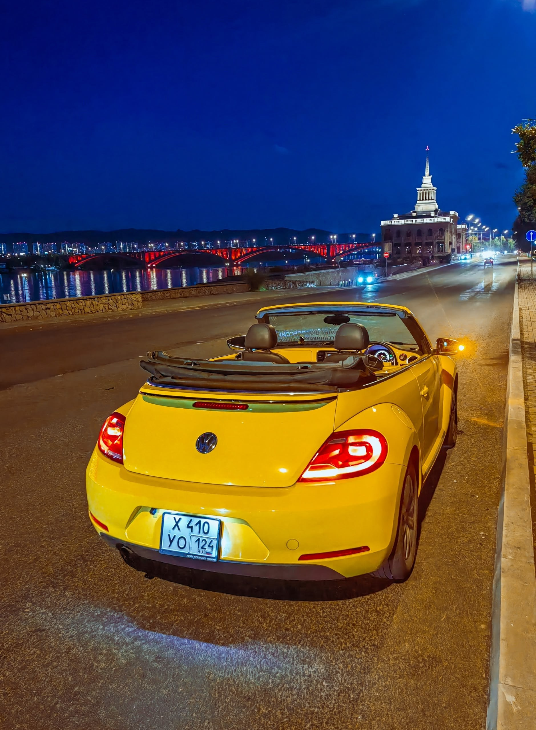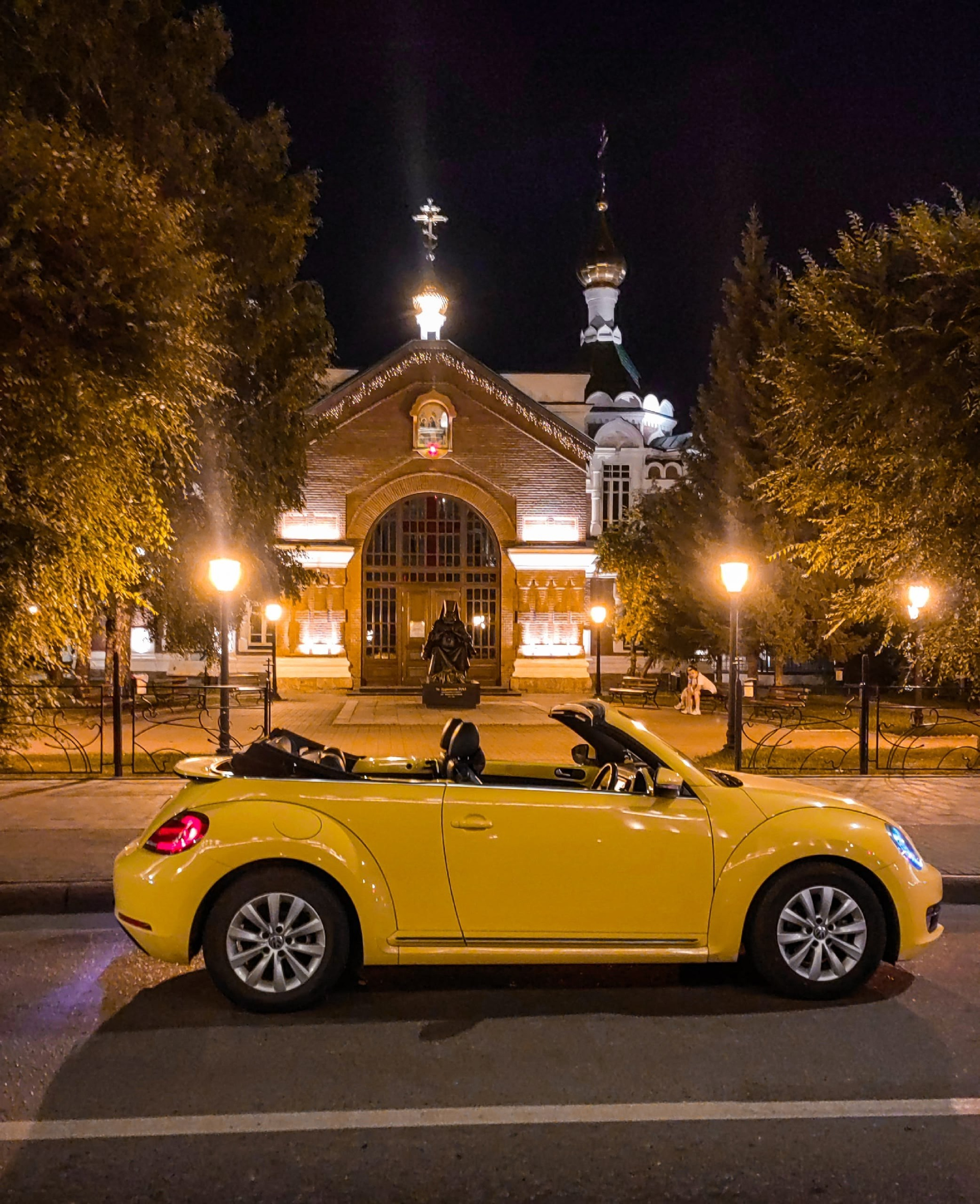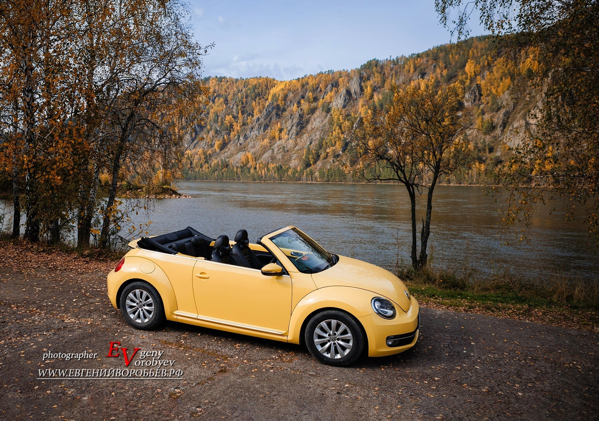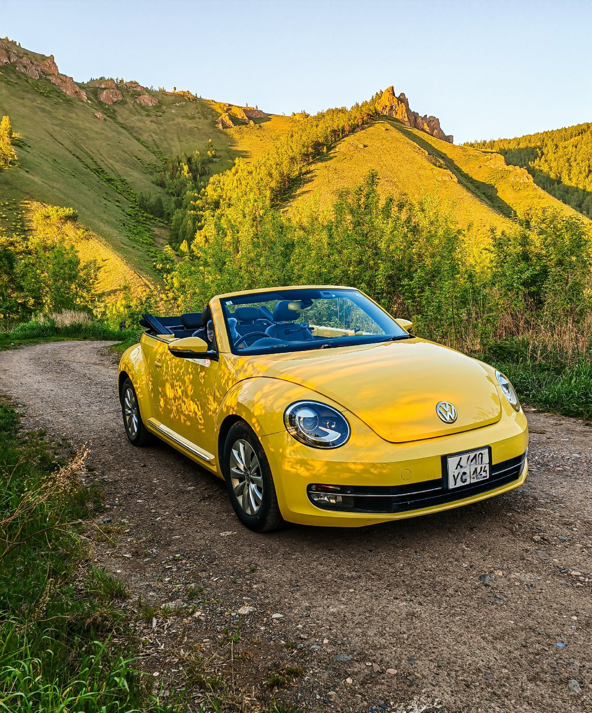 Когда тепло: легендарный кабриолет Volkswagen Beetle — тот самый Фольксваген Жук жёлтого цвета, для 3 пассажиров — незабываемые эмоции от поездки на кабриолете по Красноярску, стильные фото с ретро‑автомобилем на фоне городских и природных достопримечательностей.